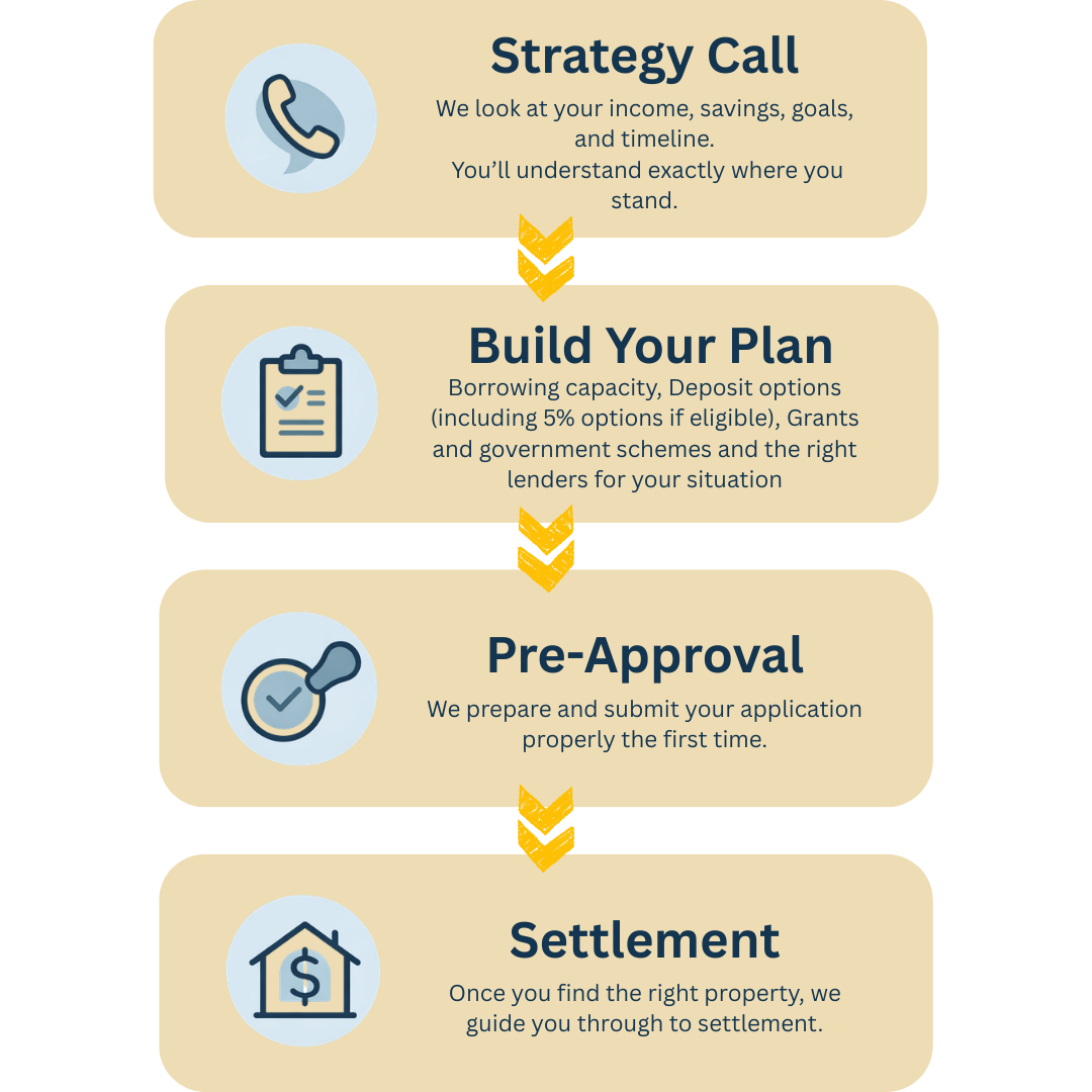 I work closely with first home buyers to understand their income, savings, and long-term goals, then build a lending strategy that gives them the strongest chance of approval. From deposit planning and borrowing capacity to grants and lender selection, I guide you through every step.